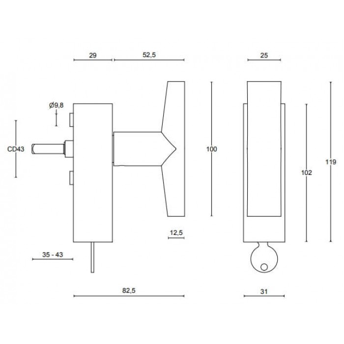 Lengte kruk 100mm. Afmeting kast 102x31mm.
