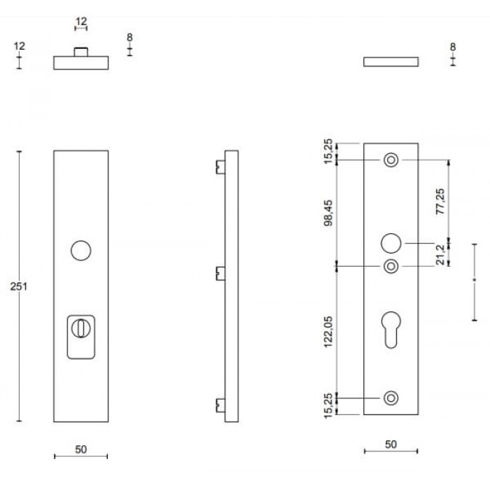 Schild 251x50mm. U kunt het gewenste type kruk voor de binnen-en buitenzijde (gatdelen) bijbestellen.